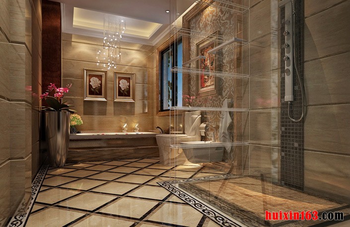 客厅中的地面采用了带有拼花图案的地砖,整齐的花纹使房间中的设计以及摆设都显得非常有秩序,电视背景墙上使用了人造石做造型设计,并在四周安装了一圈香槟色的镜面装饰,十分高档的设计,更是为客厅增添了一份华丽与唯美,电视上方悬挂了一面具有独特造型的镜面装饰,别致的造型汇聚了整间房屋设计的灵魂。石膏板吊顶中间低垂着一盏华丽的水晶灯饰,整体效果非常的大气、高雅,晶莹剔透的水晶配饰着实为客厅增添了不少的浪漫之意。卫生间的装饰比较简洁,拼花系列的地砖装饰着地面,单独的淋浴房设计,巧妙的将干湿空间分割开来,时尚且又实用的设计非常符合现代装修的理念。